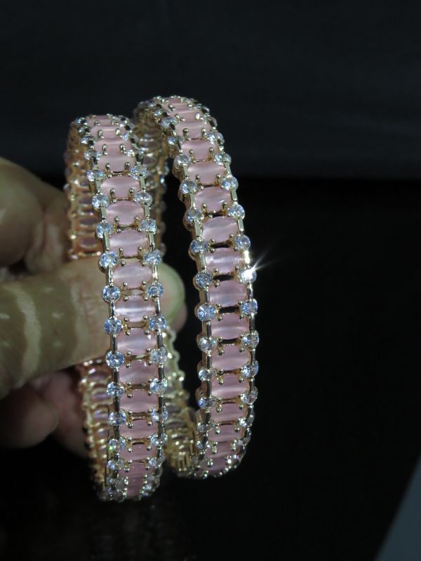Type : American Diamond Bangles & BraceletsMetal : BrassColor : Metal color rose gold with peach stonesPurpose : Fancy, casual wear, partywear for ladiesIn the Box : 1 pair of Bangles Polish lasts fo ... Read more