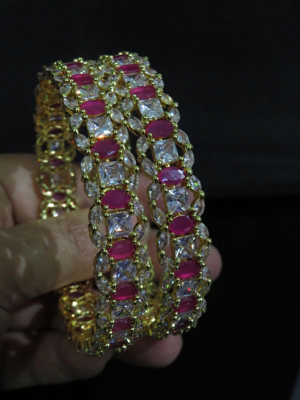 Type : American Diamond Bangles & BraceletsMetal : BrassColor : Metal color golden with ruby white stonesPurpose : Fancy, casual wear, partywear for ladiesIn the Box : 1 pair of Bangles Polish lasts ... Read more