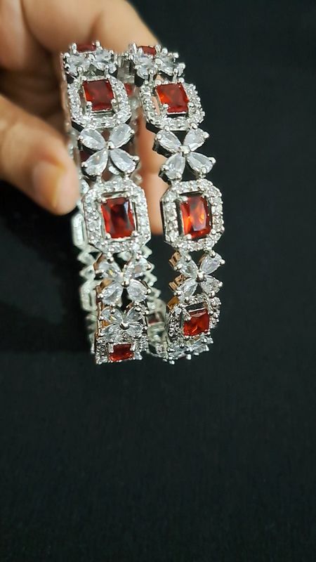 Type : American Diamond Bangles & BraceletsMetal : BrassColor : Metal color silver with red square stonePurpose : Fancy, casual wear, partywear for ladiesIn the Box : 1 pair of Bangles Polish lasts f ... Read more