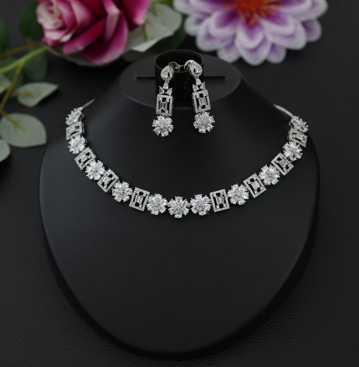 American Diamond Necklace in Brilliant look, studded with Ruby stones in Floral Look. ...