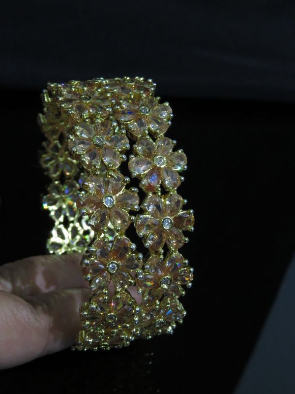 Type : American Diamond Bangles & BraceletsMetal : BrassColor : Metal color golden with champagne stonesPurpose : Fancy, casual wear, partywear for ladiesIn the Box : 1 pair of Bangles Polish lasts f ... Read more